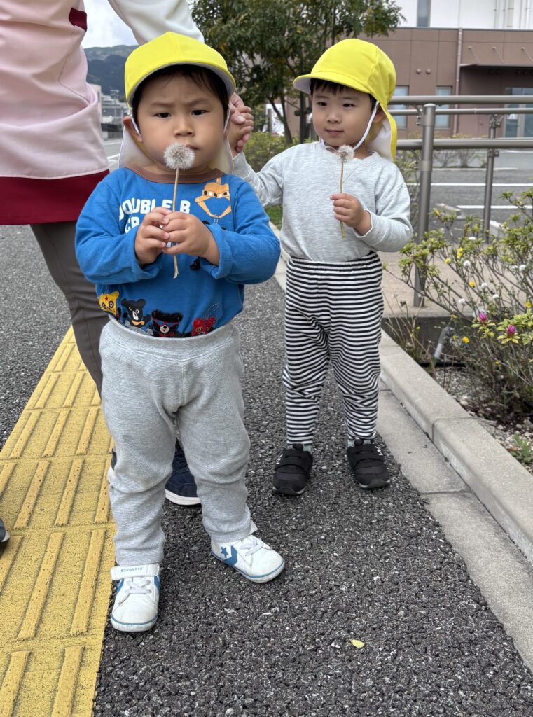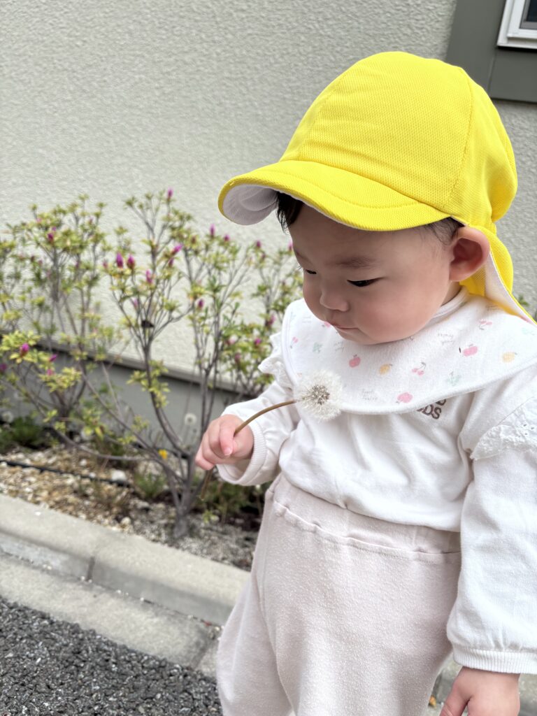 お散歩で、見つけたタンポポ「ふ~っ」と吹くと、ふわふわの種が飛んでいって大喜びです✨